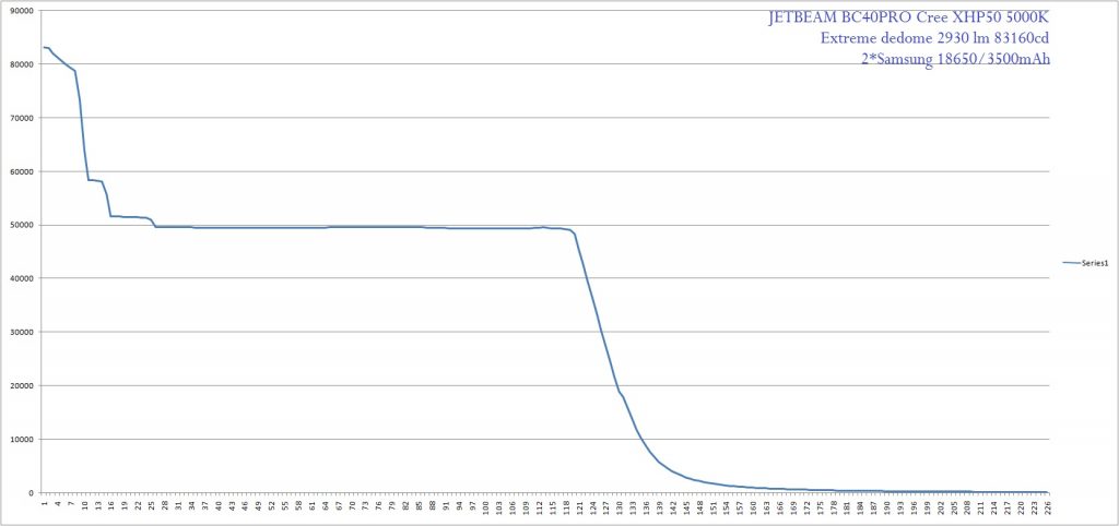 Ledul utilizat este un Cree XHP50 modificat prin metoda dedome astfel puterea maxima atinge 2930 lumeni, temperatura de culoare fiind la 4500K. Reflectorul lanternei este realizat dintr-o singura bucata din aliaj de aluminiu aviatic, si este unul neted, fin lucios pentru o oferi un fascicol concentrat pe o distanta cat mai mare. Lentila lanternei este din sticla tratata si are o grosime consistenta, astfel ca este potrivit si pentru jocurile nocturne de airsoft. Componentele electronice sunt protejate de socuri de un inel realizat din otel inoxidabil ce este insurubat pe marginea capului lanternei, si care datorita dintilor poate fi utilizat si pentru autoaparare. Circuitul lanternei este una liniara, indiferent de treptele lanternei intensitatea va fi mentinuta constanta. In timpul functionarii circuitul nu emite sunete deranjante pe nici o treapta, si nu sunt vizibile palpairi (PWM). Circuitul electronic al lanternei este prevazut cu un sistem de control al temperaturii, protejand astfel impotriva supraincalzirii lanternei. Intensitatea maxima ce poate atinge lanterna Jetbeam BC40PRO dedome e de 83160 cd, iar distanta de bataie a fascicolului e de aproximativ 650 metri. Pornirea si oprirea lanternei se face prin apasarea butonului de pe coada manerului, iar schimbarea diferitelor trepte si activarea stroboscopului din butonul lateral ce este situat sub capul lanternei. Butonul de selectie a treptelor este iluminat atit in timpul utilizarii lanternei cat si in timpul incarcarii acumulatorului. Circuitul electronic este prevazut cu memorie, astfel ultima treapta folosita va fi memorata. Pentru functionarea lanternei sunt necesari doi acumulatori 18650, sau patru baterii CR123. Butonul situat pe coada manerului are functie si de aprindere momentana, apasand doar usor butonul pana la jumatate.